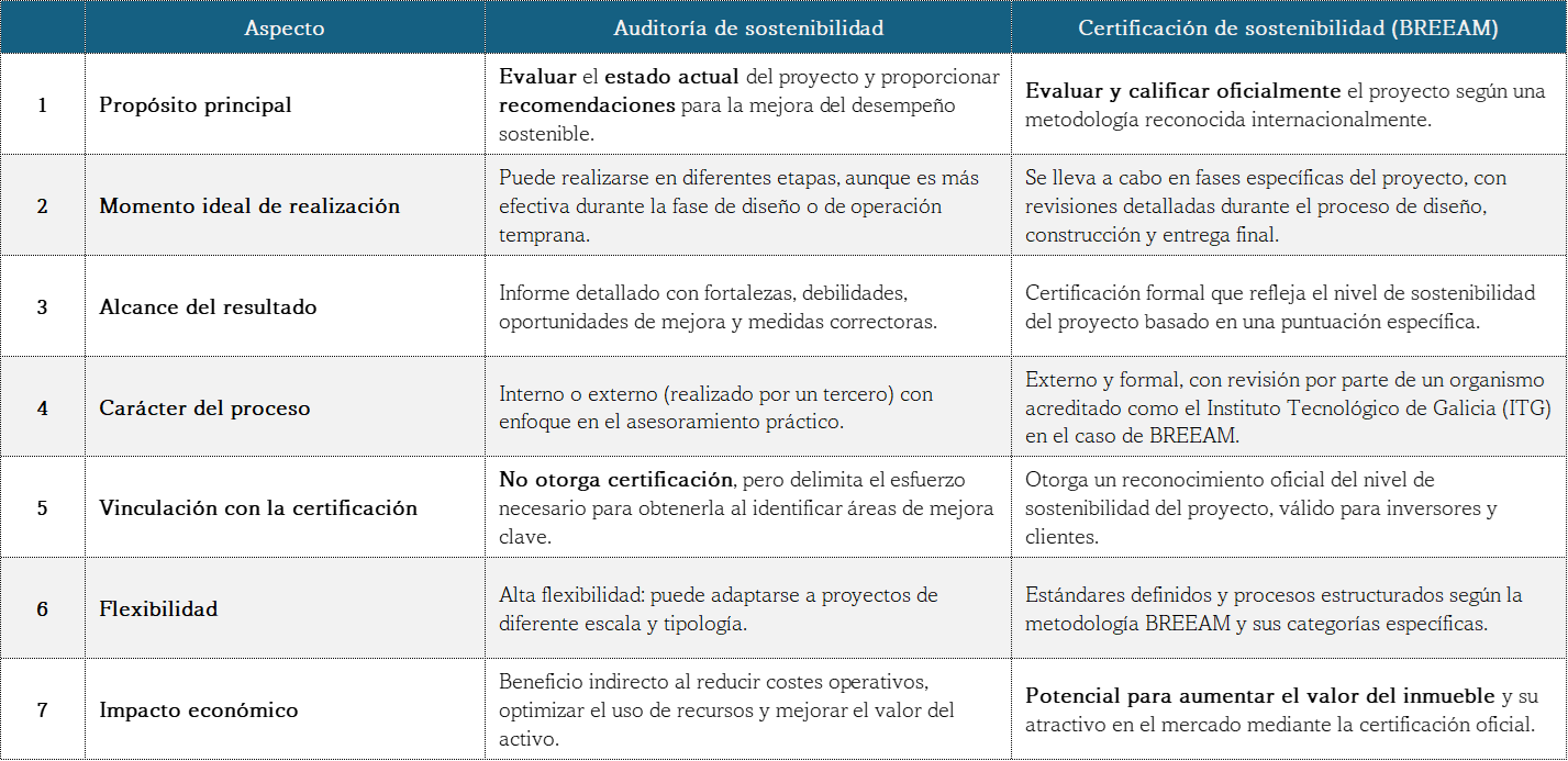 Esta diferenciación destaca cómo una auditoría de sostenibilidad es una herramienta previa y complementaria a la certificación, guiando a los equipos de proyecto en la toma de decisiones antes de embarcarse en el proceso formal de certificación.